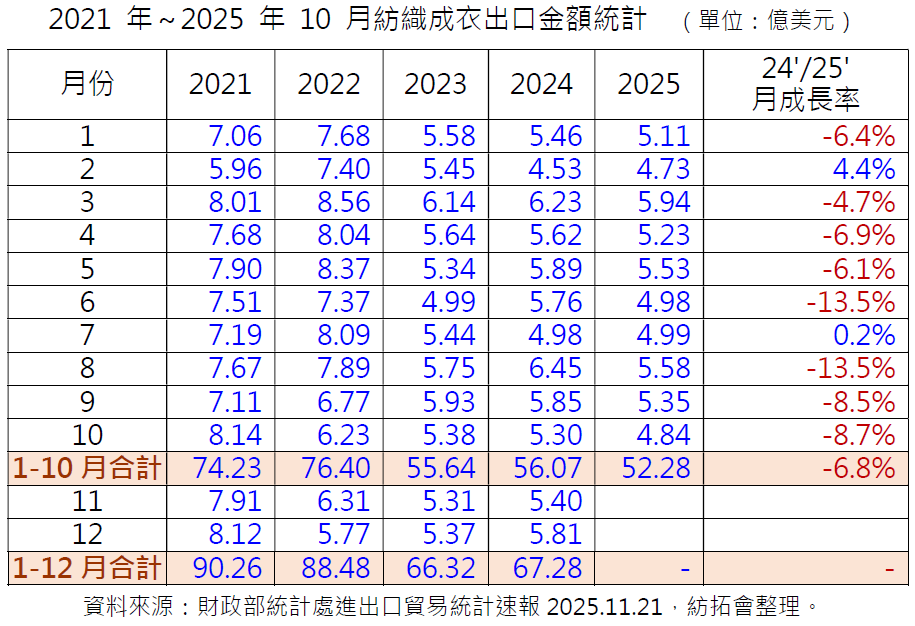 2025 年 11 月份臺灣紡織成衣出口金額為 4.7 億美元,較前一年(2024 年) 11 月份之 5.4 億美元衰退 13%;累計 2025 年 1-11 月臺灣紡織成衣出口金額合計為 56.98 億美元,較前一同期之 61.47 億美元衰退 7.3%。