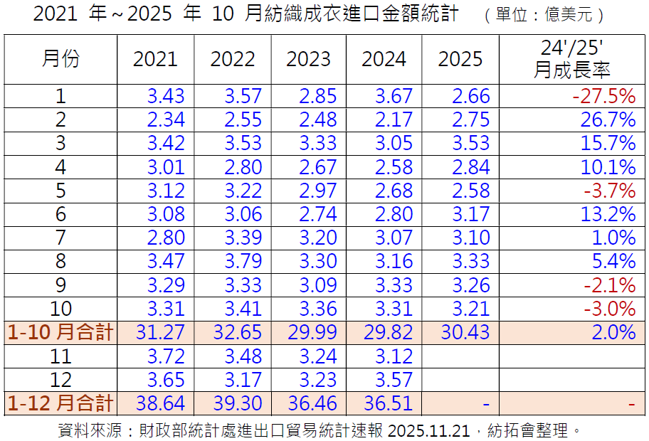 2025 年 11 月份臺灣紡織成衣進口金額為 3.43 億美元,較前一年(2024 年) 11 月份之 3.1 億美元成長 10.6%;累計 2025 年 1-11 月臺灣紡織成衣進口金額合計為 33.86 億美元,較前一年同期之 32.92 億美元成長 2.9%。