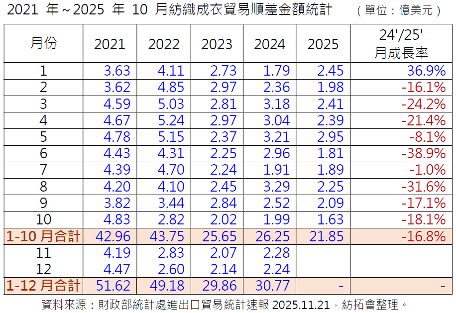 2025 年 11 月份臺灣紡織成衣產品貿易順差(=出口金額-進口金額)金額為 1.27 億美元,較前一年(2024 年) 11 月份之 2.3 億美元衰退 44.8%;累計 2025 年 1-11 月臺灣紡織成衣貿易順差金額合計為 23.12 億美元,較前一年同期之 28.55 億美元衰退 19%。