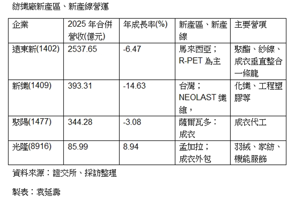 為降緩對等關稅的衝擊,以及爭取客戶對多元產地的需求,紡纖廠積極投入新產地、新產線開拓,今(2026)年可望陸續收成,遠東新馬來西亞R-PET廠、新纖彈性纖維產線也將在第四季量產、聚陽薩爾瓦多、振大環球印尼產線、光隆孟加拉外包產線,陸續從第二季到年底投產,可望為2026年的營運有加分。