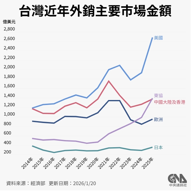 經濟部統計處於1月20日公布去(2025)年12月以及全年度外銷訂單統計,觀察5大市場表現,美國與東協去年12月單月金額創歷年同月新高,分別為283.9億美元、135.4億美元,增幅也高達5、6成。