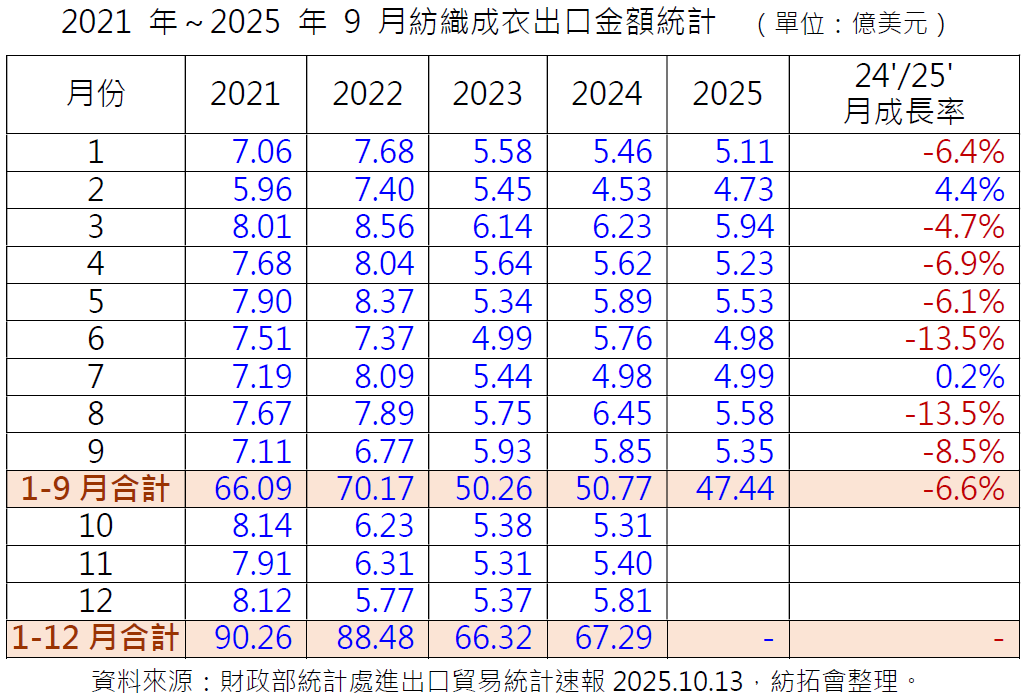 2025 年 9 月份臺灣紡織成衣出口金額為 5.35 億美元,較前一年(2024 年) 9 月份之 5.85 億美元衰退 8.5%;累計 2025 年 1-9 月臺灣紡織成衣出口金額合計為 47.44 億美元,較前一同期之 50.77 億美元衰退 6.6%。