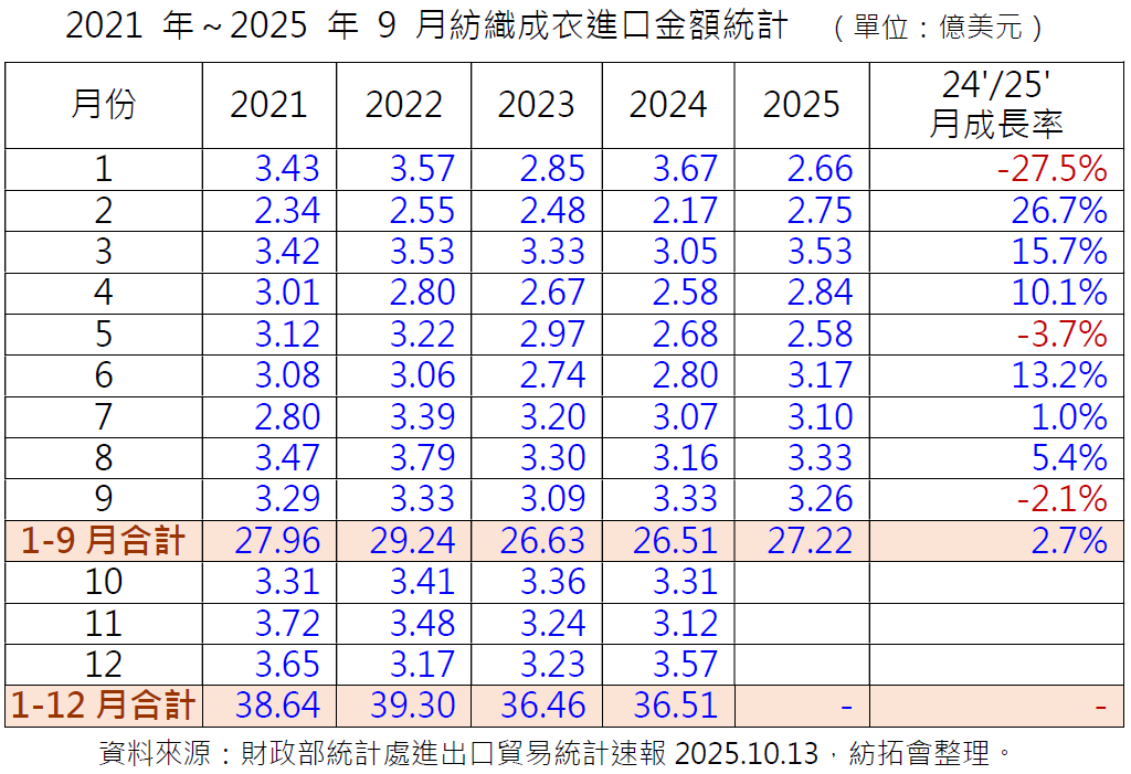 2025 年 9 月份臺灣紡織成衣進口金額為 3.26 億美元,較前一年(2024 年) 9 月份之 3.33 億美元衰退 2.1%;累計 2025 年 1-9 月臺灣紡織成衣進口金額合計為 27.22 億美元,較前一年同期之 26.51 億美元成長 2.7%。