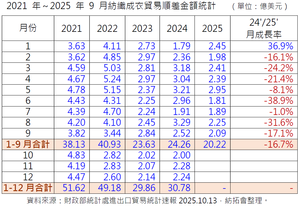 2025 年 9 月份臺灣紡織成衣產品貿易順差(=出口金額-進口金額)金額為 2.09 億美元,較前一年(2024 年) 9 月份之 2.52 億美元衰退 17.1%;累計 2025 年 1-9 月臺灣紡織成衣貿易順差金額合計為 20.22 億美元,較前一年同期之 24.26 億美元衰退 16.7%。